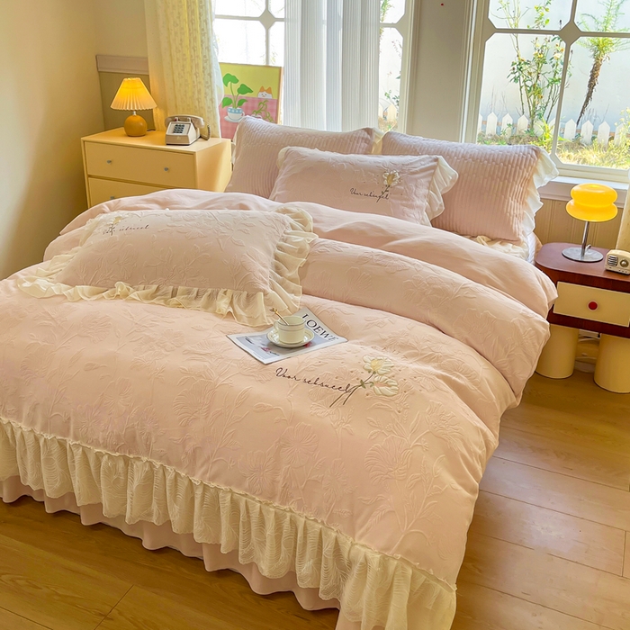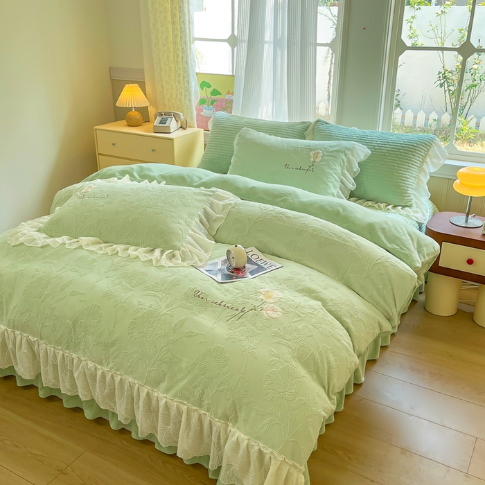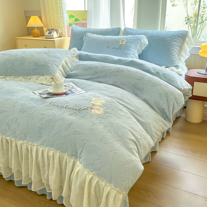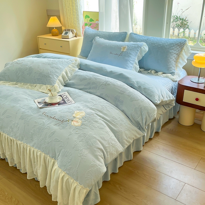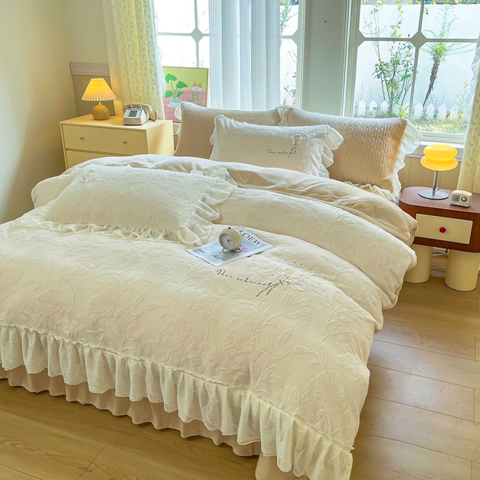 当前位置: 木兰花> 产品中心 > 2025新款纯色雕花全消光牛奶绒蕾丝绣花被套夹棉床盖款四件套